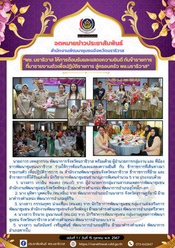 นายถาวร เทพสุวรรณ พัฒนาการจังหวัดนราธิวาส พร้อมด้วย ผู้อำนวยการกลุ่มงาน และ พี่น้องชาวพัฒนาชุมชนนราธิวาส ร่วมให้การต้อนรับและแสดงความยินดี กับข้าราชการที่เดินทางมารายงานตัว เพื่อปฎิบัติราชการ ณ สำนักงานพัฒนาชุมชนจังหวัดนราธิวาส ข้าราชการที่ย้าย และ ข้าราชการที่ได้รับแต่งตั้งในระดับนักวิชาการพัฒนาชุมชนชำนาญการพิเศษ จำนวน 5 ราย ประกอบด้วย